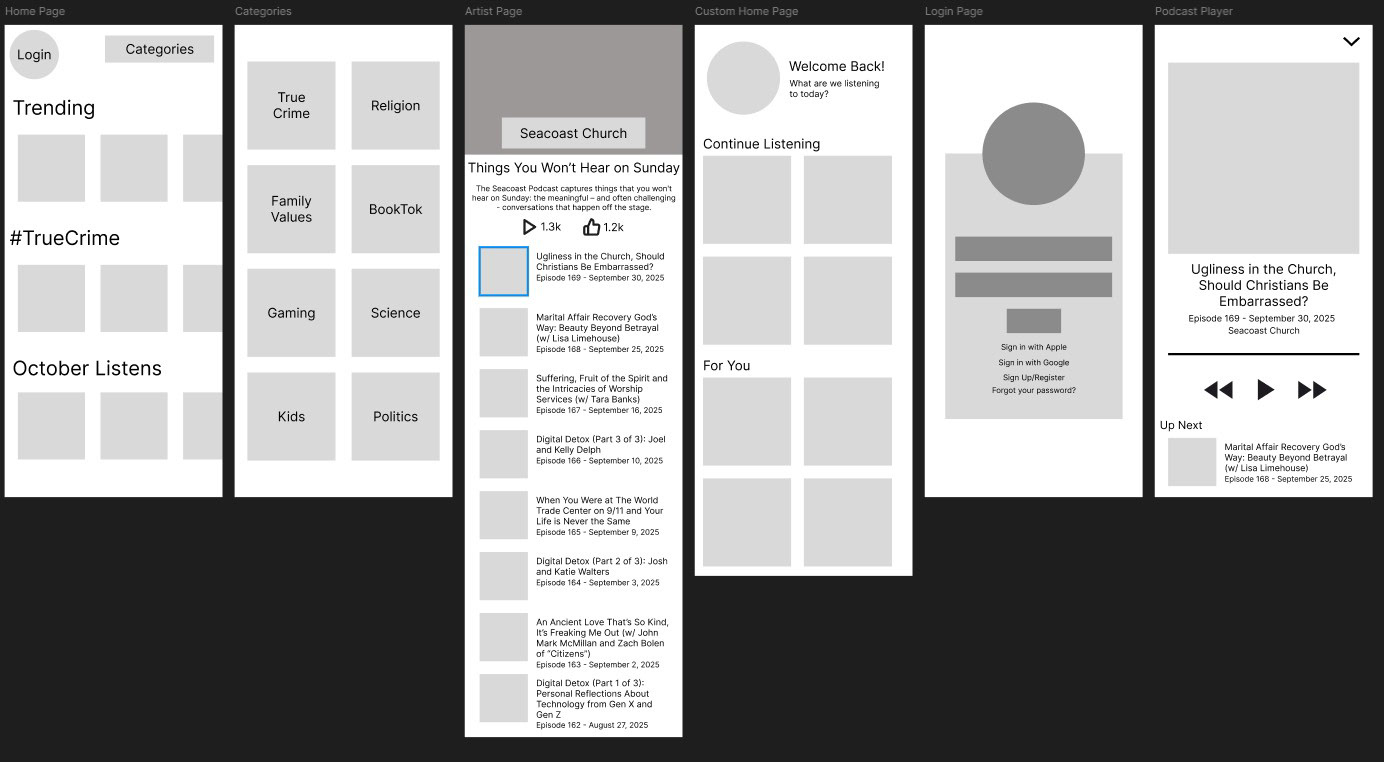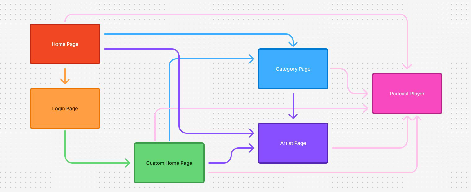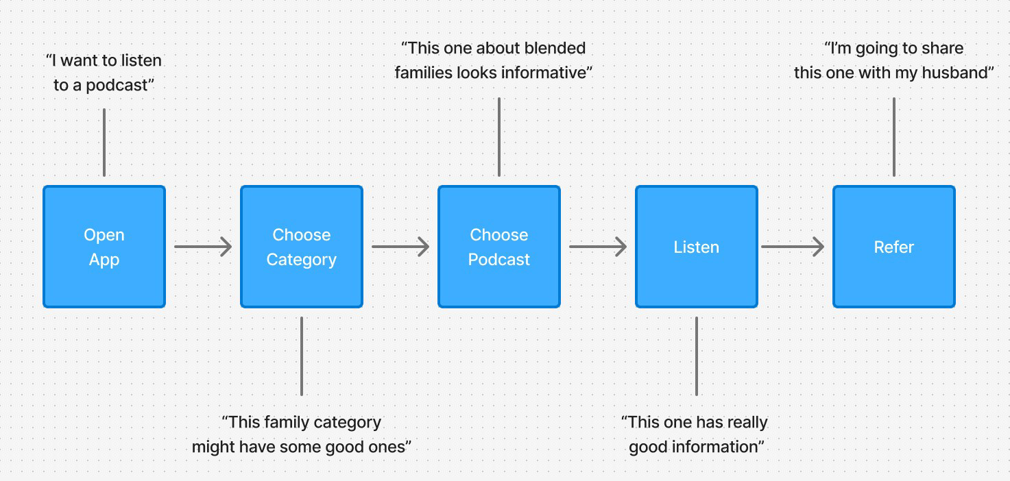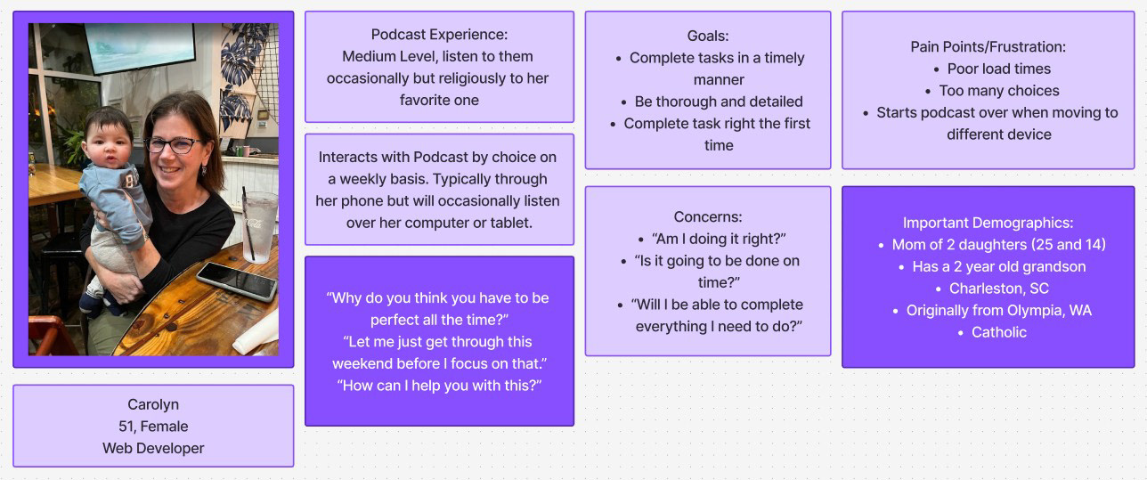 Below is the persona, customer journey map and user flow I created for a podcast application I was designing for my Interface Design 1: User Experience class at Grand Canyon University. Based on these I was able to move on into wireframes to create the layout and user experience.