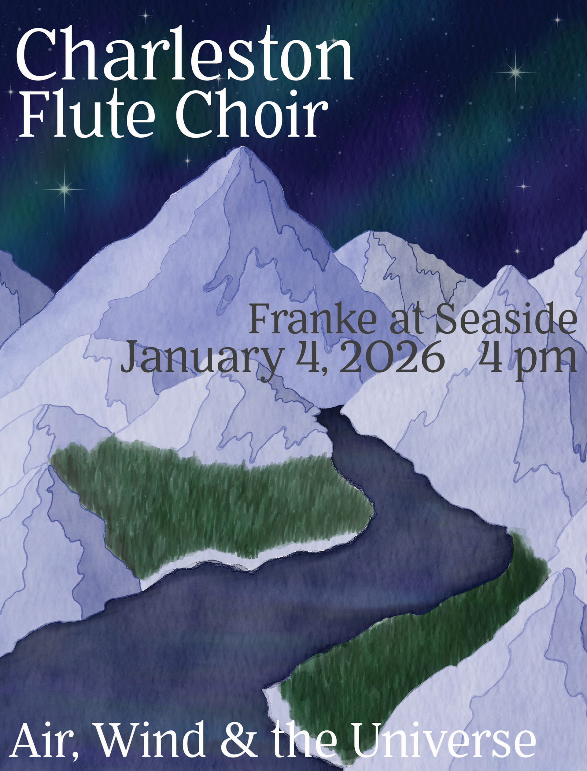 This is a poster for the Charleston Flute Choir's January concert. It was inspired by a few of the songs in their set list like "Aurora" and "Cascade". It was mainly made in Procreate on an iPad Air and text was later added in Adobe Illustrator.