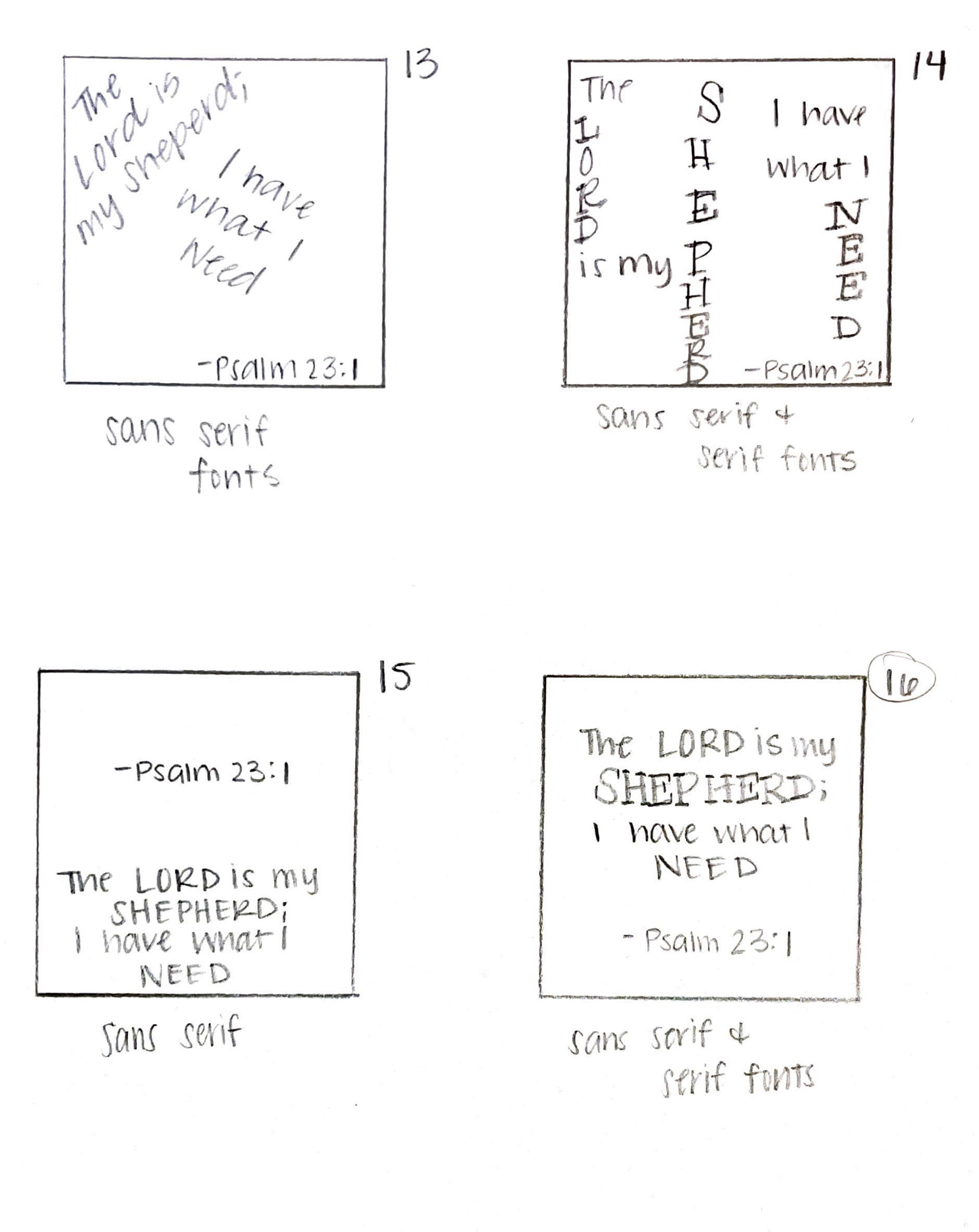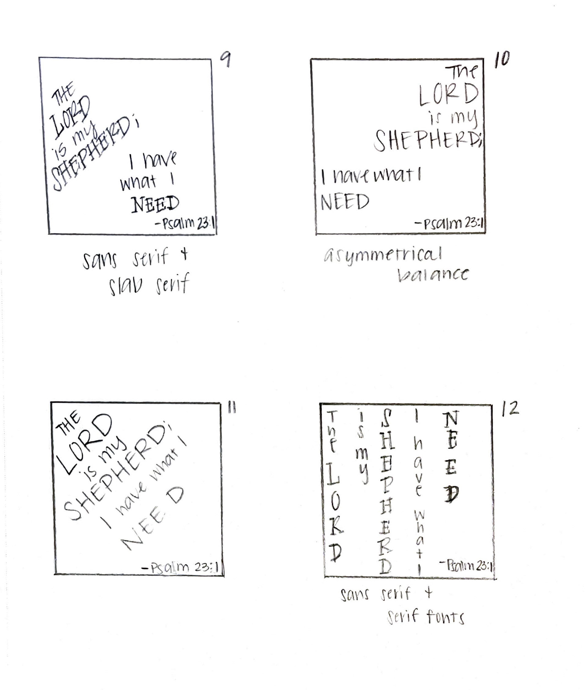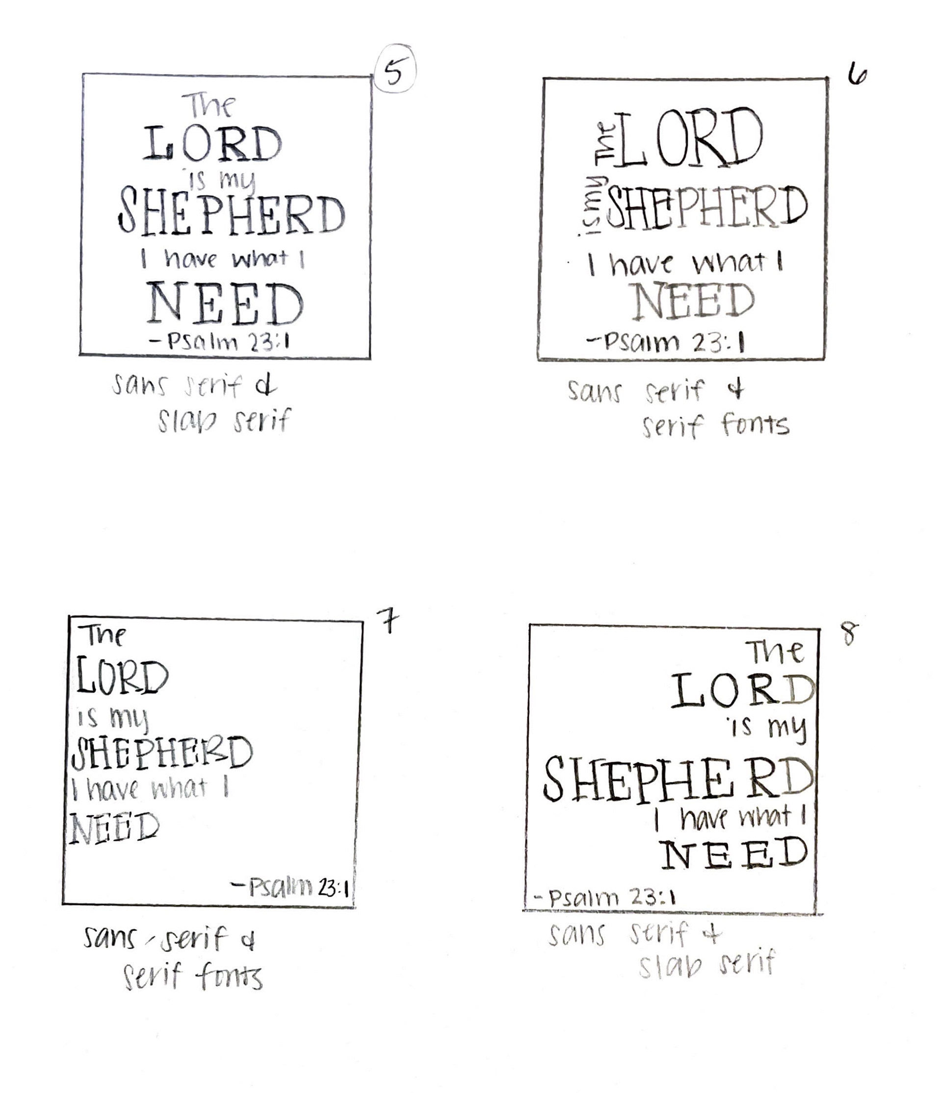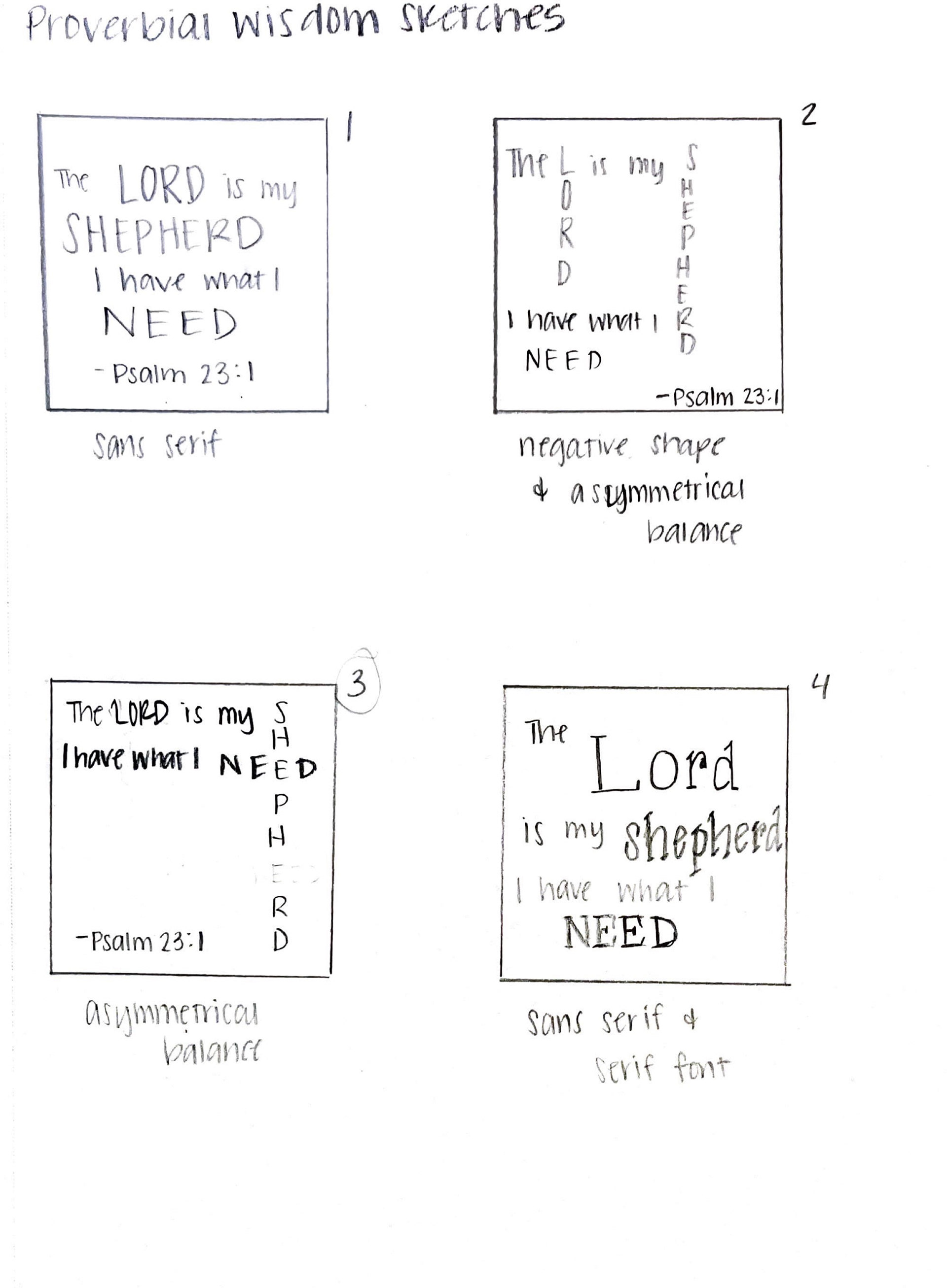 This was the assignment titled Proverbial Wisdom from my Design Thinking class at Grand Canyon University. I took the Bible verse Psalm 23:1 and created this design for social media use. Included are my roughs and sketches for this assignment.